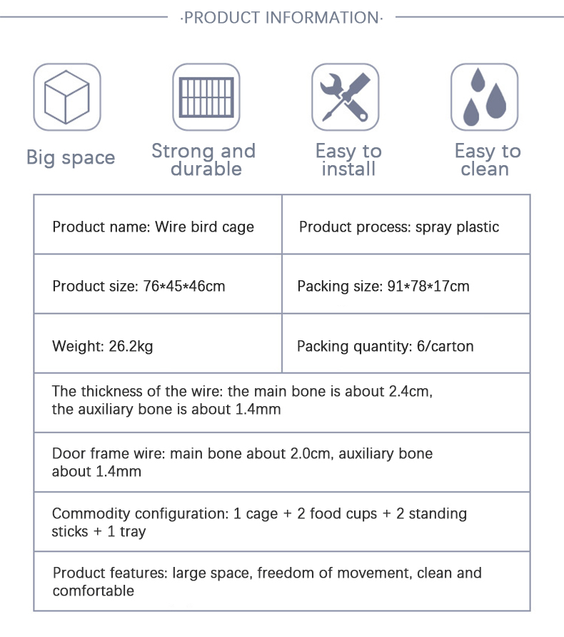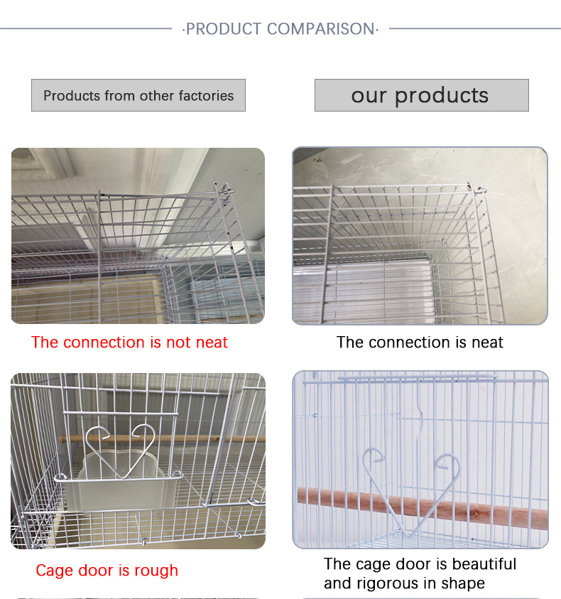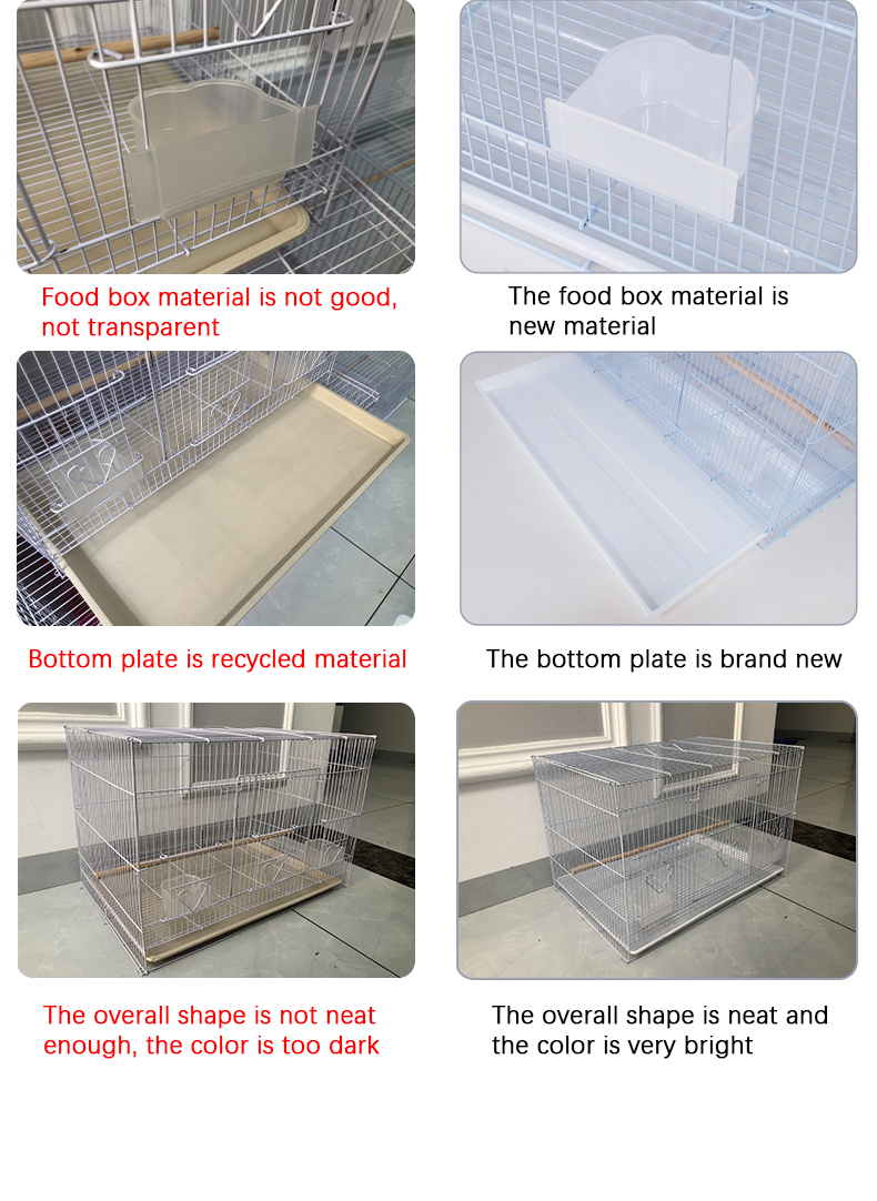 មុន៖ ទ្រុងសេកធំដែលធ្វើពីលោហធាតុដែលមានគុណភាពខ្ពស់បត់បានជាមួយនឹងស៊ុមឈើ និងប្រអប់អាហារថ្ងៃត្រង់ និងទ្រុងបក្សីមាត់។ បន្ទាប់៖ ការផ្គត់ផ្គង់ពីរោងចក្រសាមញ្ញ សេកផ្ទាល់ខ្លួនតម្លៃថោកចិនដែកអ៊ីណុកខ្នាតតូចសម្រាប់បក្សី Finches អាហ្រ្វិកទ្រុងបក្សីសេកពណ៌ប្រផេះ
