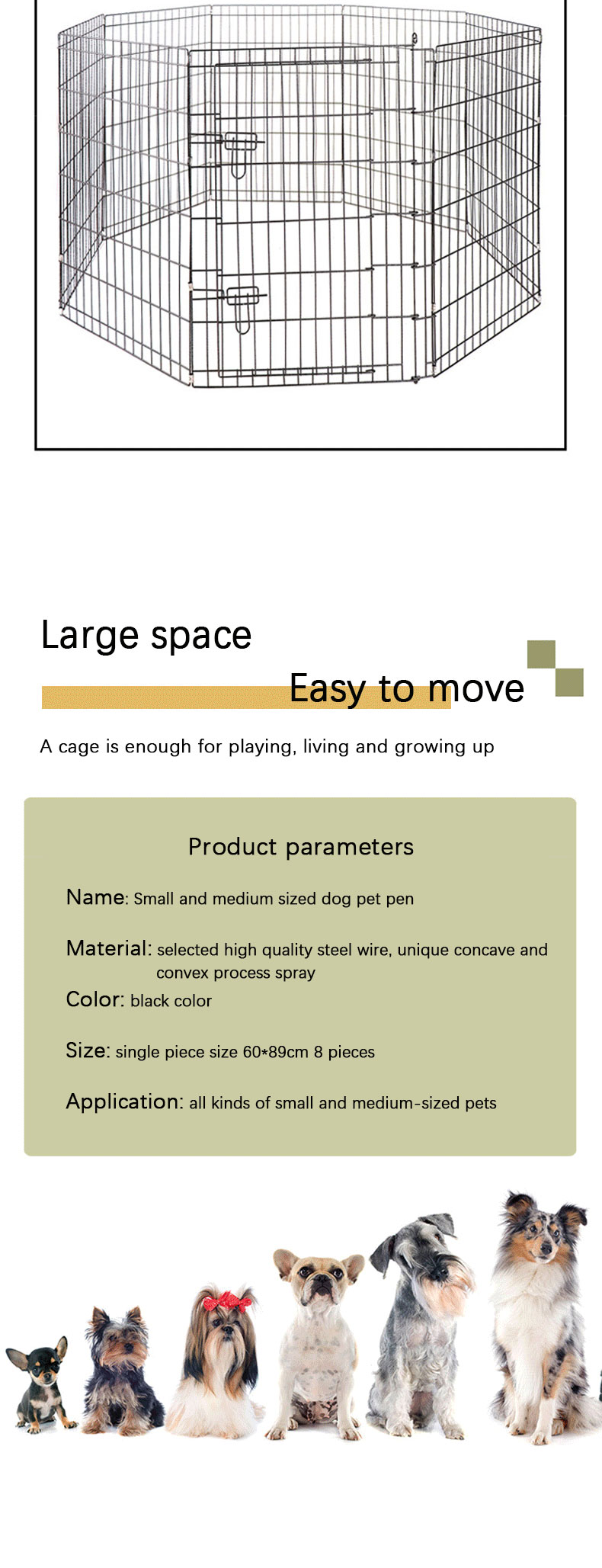1.ການປັບແຕ່ງຂະໜາດ: ປັບຂະຫນາດຮົ້ວທີ່ເຫມາະສົມໂດຍອີງໃສ່ພື້ນທີ່ພາຍໃນແລະຂະຫນາດສັດລ້ຽງ.