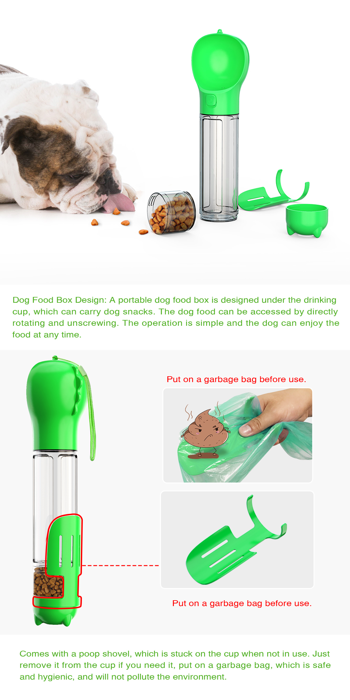 Bidhaa asili ya kampuni iliyo na hati miliki, uwezo mkubwa wa 500ML, kikombe cha maji cha kusafiri cha wanyama kipenzi kinachofanya kazi mbalimbali, kilichotengenezwa kwa nyenzo mpya zisizo na mazingira, upinzani wa joto la juu, na inaweza kuoshwa kwenye mashine ya kuosha vyombo bila deformation na kuvuja kwa maji.Inaweza kudhibitiwa kwa mkono mmoja, na kulisha maji ni rahisi zaidi, na muundo wa ndoo ya chakula cha mbwa huongezwa.Muundo wa kifungo kikubwa unaweza kurudi maji na kifungo kimoja.Pia ina kazi za kusafisha kinyesi cha mifugo na mfuko wa kuhifadhi kinyesi cha wanyama.